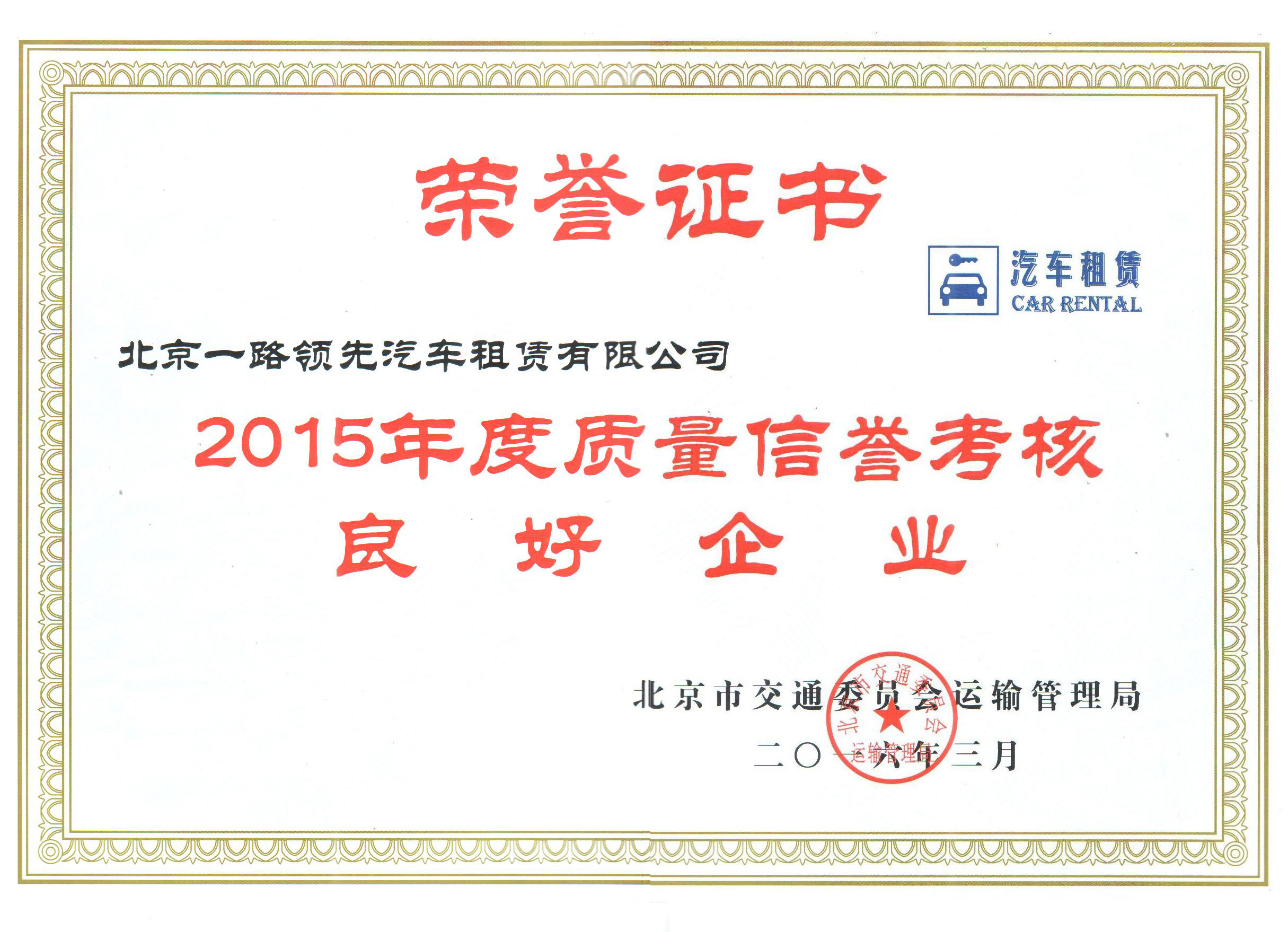 2016年04月08日熱烈慶祝北京一路領先汽車租賃有限公司榮獲優(yōu)秀良好企業(yè)榮譽